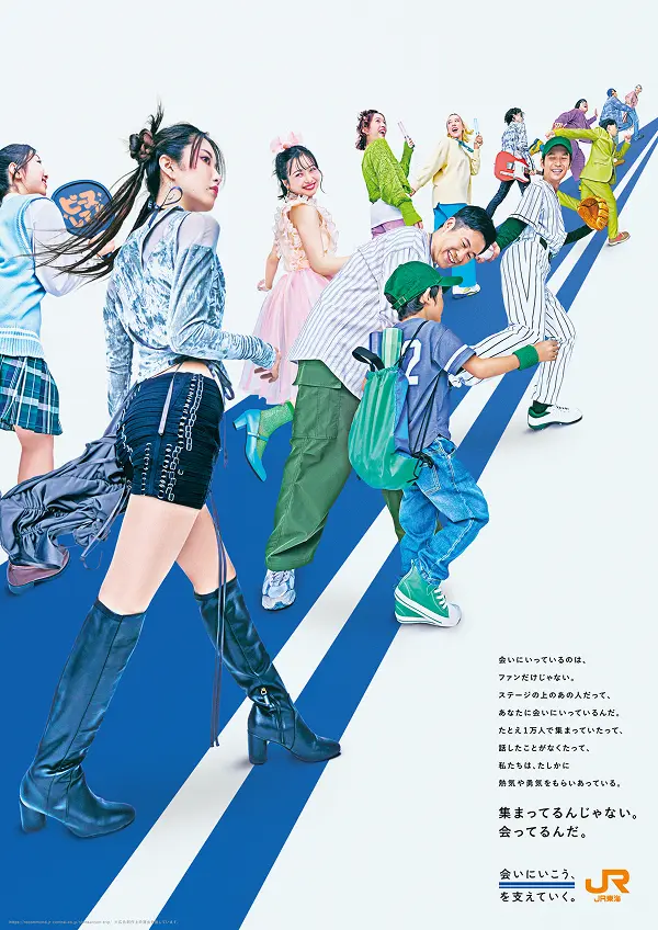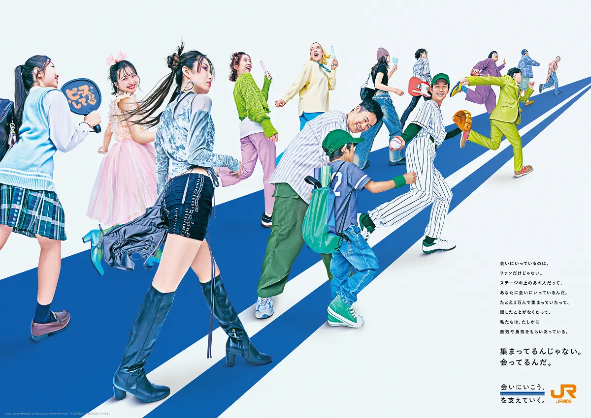 「観客席に立つ人」と「ステージ・グラウンドに立つ人」との間に生まれる熱量や一体感を、それぞれのファンが東海道新幹線で「会いにいく」までの道のりを描きながら、実際の会場で撮影しました。