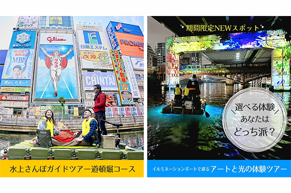 大阪の人気観光スポット道頓堀をボートに乗って楽しめるガイドツアー「水上さんぽ」。高速道路の橋脚に世界最大級のスケールで幻想的な映像を展開するプロジェクションマッピングを水上から鑑賞する「アートと光の体験ツアー」。2種類のスペシャルな体験から、お好きな方をご予約ください。※事前予約完了後、利用日2日前以降の「ずらし旅 選べる体験」選択内容は変更できません。