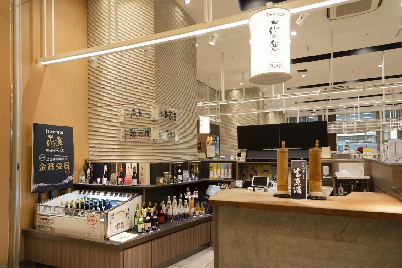 浜松駅構内、花の舞酒造エキマチ店にて花の舞こだわりの地酒2種を飲み比べ。さらに、花の舞くらふと生3本セット(180mlボトル缶)をお持ち帰りいただけます。