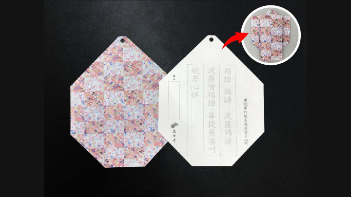 ②ねね様小袖の柄を再現した小袖形の紙に写経・奉納